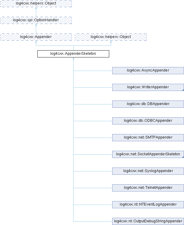 Reimplemented in log4cxx::AsyncAppender, log4cxx::ConsoleAppender, log4cxx::db::DBAppender, log4cxx::db::ODBCAppender, log4cxx::FileAppender, log4cxx::net::SMTPAppender, log4cxx::net::SocketAppenderSkeleton, log4cxx::net::SyslogAppender, log4cxx::net::TelnetAppender, log4cxx::nt::NTEventLogAppender, log4cxx::rolling::RollingFileAppender, and log4cxx::WriterAppender.