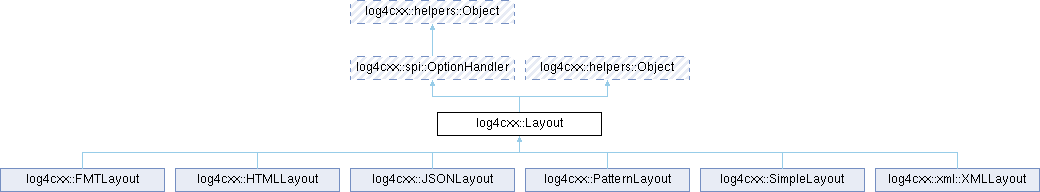Implemented in log4cxx::FMTLayout, log4cxx::HTMLLayout, log4cxx::JSONLayout, log4cxx::PatternLayout, log4cxx::SimpleLayout, and log4cxx::xml::XMLLayout.