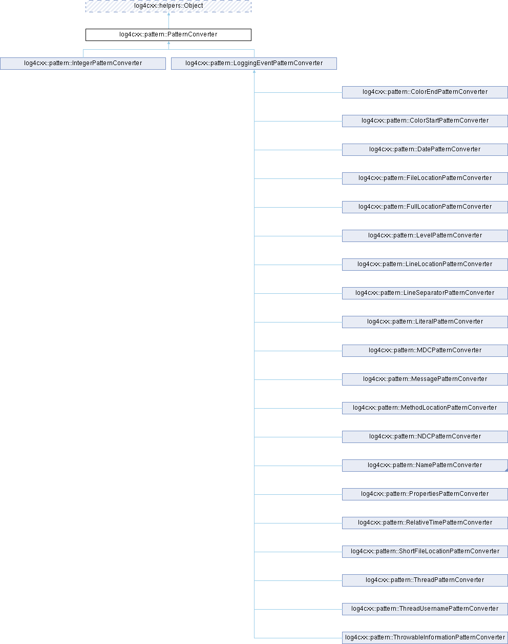 Implemented in log4cxx::pattern::ColorEndPatternConverter, log4cxx::pattern::ColorStartPatternConverter, log4cxx::pattern::DatePatternConverter, log4cxx::pattern::FileLocationPatternConverter, log4cxx::pattern::FullLocationPatternConverter, log4cxx::pattern::IntegerPatternConverter, log4cxx::pattern::LevelPatternConverter, log4cxx::pattern::LineLocationPatternConverter, log4cxx::pattern::LineSeparatorPatternConverter, log4cxx::pattern::LiteralPatternConverter, log4cxx::pattern::LoggingEventPatternConverter, log4cxx::pattern::MDCPatternConverter, log4cxx::pattern::MessagePatternConverter, log4cxx::pattern::MethodLocationPatternConverter, log4cxx::pattern::NDCPatternConverter, log4cxx::pattern::PropertiesPatternConverter, log4cxx::pattern::RelativeTimePatternConverter, log4cxx::pattern::ShortFileLocationPatternConverter, log4cxx::pattern::ThreadPatternConverter, and log4cxx::pattern::ThrowableInformationPatternConverter.